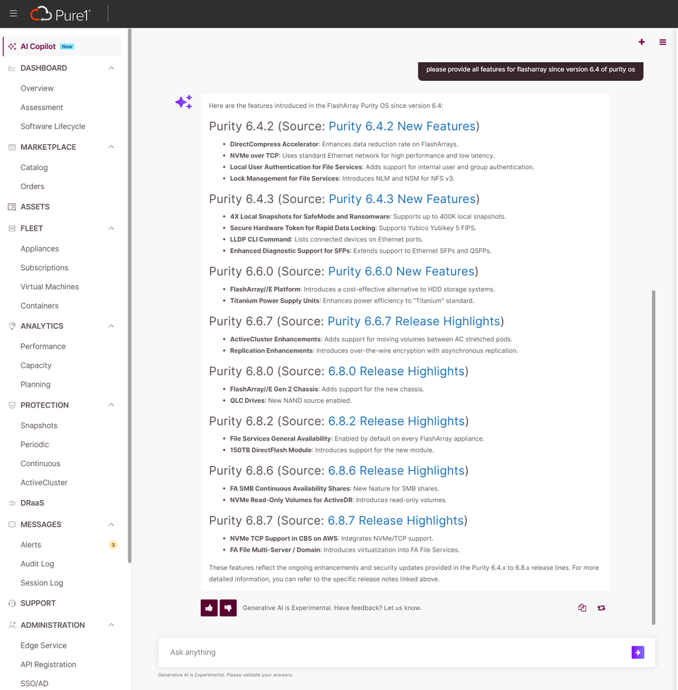 Log into Pure1, click on the AI Copilot tab, and type your question. My coworker reminded me of this last week, so I tried: “Please provide all features for FlashArray since version 6.4 of Purity OS.” Copilot returned a detailed rundown of new capabilities across each release.