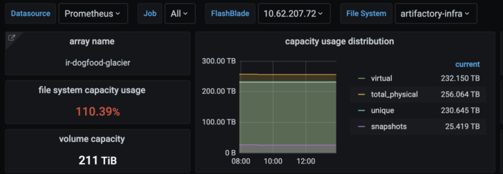 PersistentVolumeClaims enable persistent storage for both Prometheus and Grafana. The result is that both metric data and dashboards persist even with restarts. I leverage an already-installed Pure Service Orchestrator (PSO) to persist these volumes on a FlashBlade via the “pure-file” StorageClass.