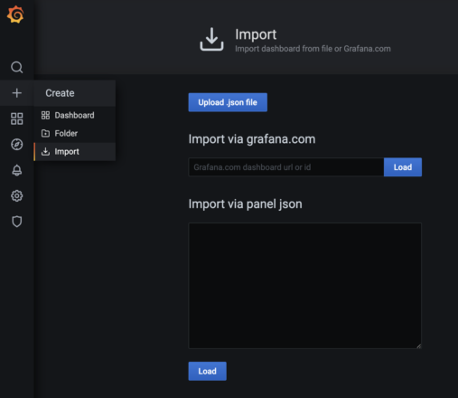 To import a dashboard in Grafana, click on the “+” and then “Import” in Grafana.