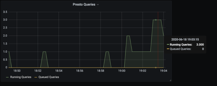I can then plot interesting metrics, such as “running_queries” and “queued_queries” easily in Grafana: