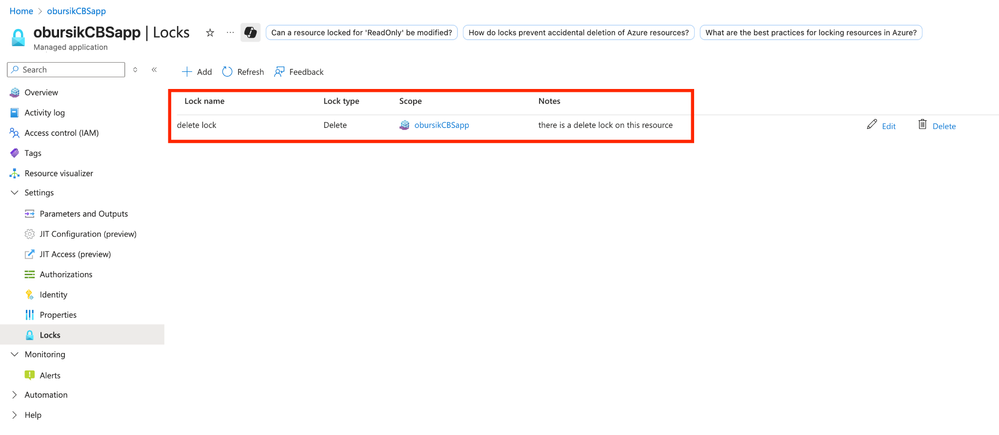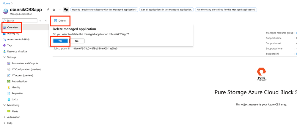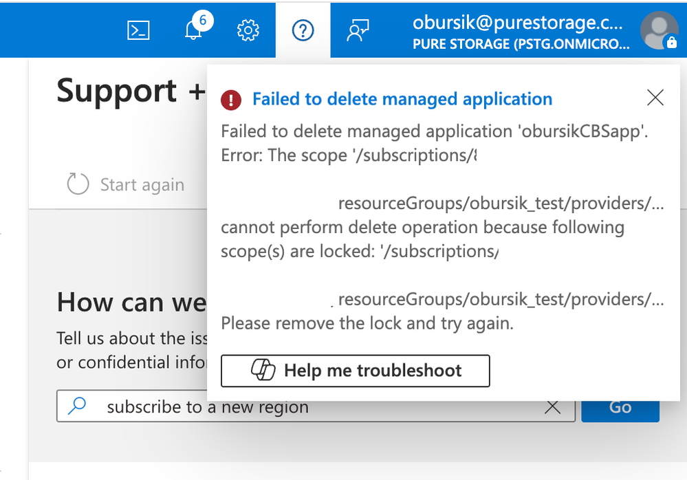 - See that an error message appears, confirming the Lock is in place and does prevent accidental deletion of the Managed application of the PSC Dedicated array