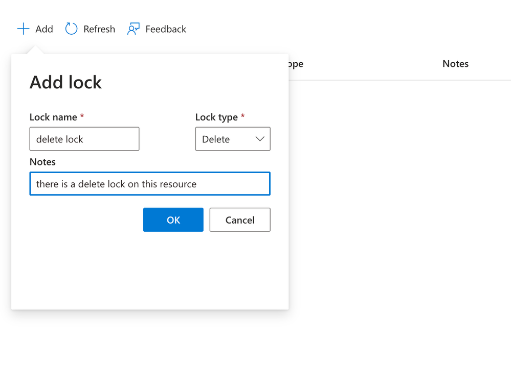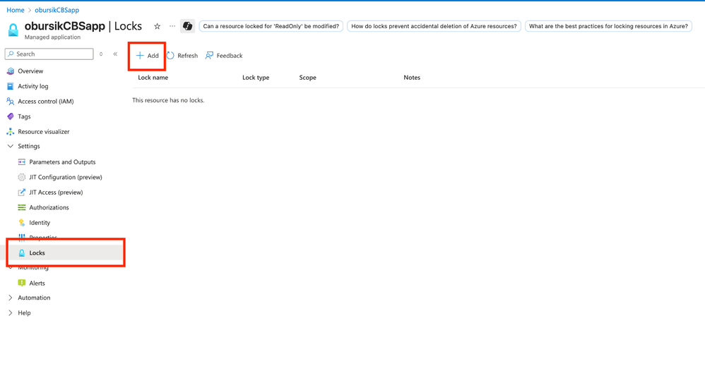 - Add a New Lock: Click the + Add button at the top of the Locks blade.