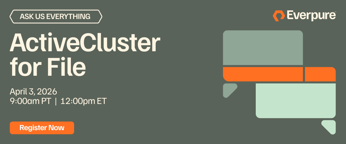This month we’re diving into ActiveCluster™ for File and how the Everpure Platform delivers synchronous file replication as a native capability. As file data grows and availability requirements increase, infrastructure teams need data mobility and business continuity that’s automated, transparent, and built into the platform they already trust.